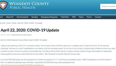 Thursday: 20 confirmed, 1 probable case in county Thursday, Wyandot County Public Health reported a total of 21 coronavirus cases, including 20 lab confirmed cases and one probable case in Wyandot County. Of the reported individuals, there are no current hospitalizations, two deaths and four recoveries. Confirmed cases include one female in her 20s with an onset date of April 14; two females in their 30s with onset … Read More