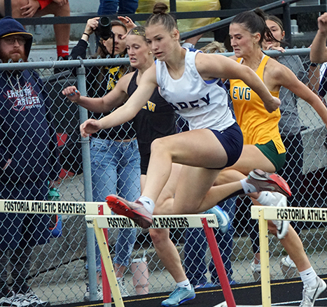 Carey’s Elysa Holsinger vaults the final hurdle in the 300 hurdles at the Division III regional track meet Friday. Holsinger finished fifth and earned an at-large bid to the state track meet.