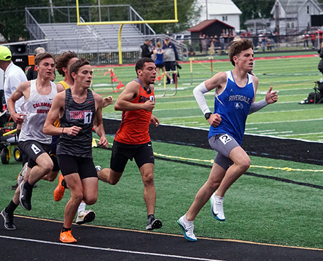 Riverdale’s Kolten Evans (front) takes the lead in the 3200 run at the Division III regional track meet Friday at Fostoria. Evans qualified for state with a third-place finish in the event.
