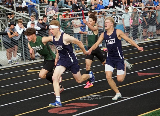 Carey’s Tripp Phoenix passes the baton to relay teammate Brody Baker in the 800 relay Friday at the Division III regional track meet. The relay team qualified for state with a fourth-place finish.