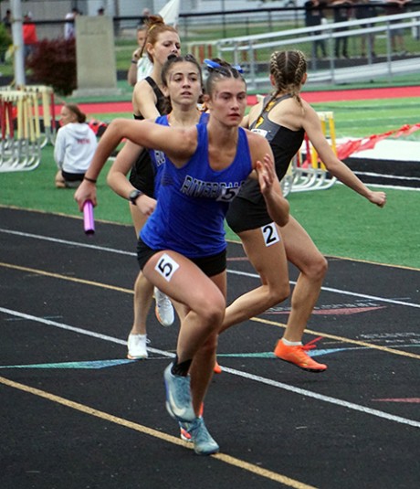 Riverdale’s Marissa Bonham takes off for the final leg of the 1600 relay after receiving the baton from teammate Allison Woodruff in the Division III regionals Friday. They set a school record and qualified for state in fourth place.