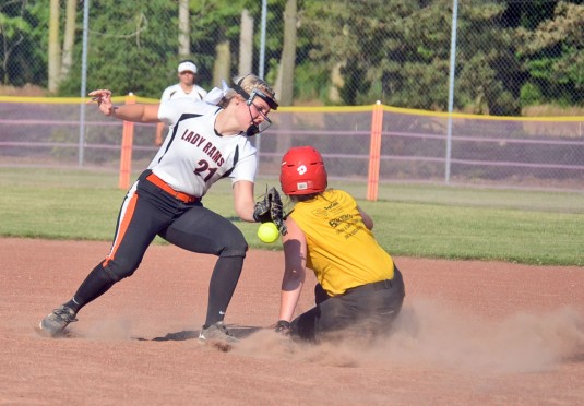 Upper Sandusky’s Hannah McKinniss (21) is unable to maintain possession of the ball as she attempts to put a tag on a Colonel Crawford base runner Tuesday. The Eagles walked off 9-8 winners in eight innings.