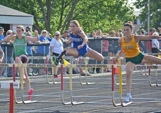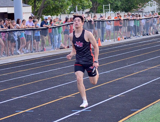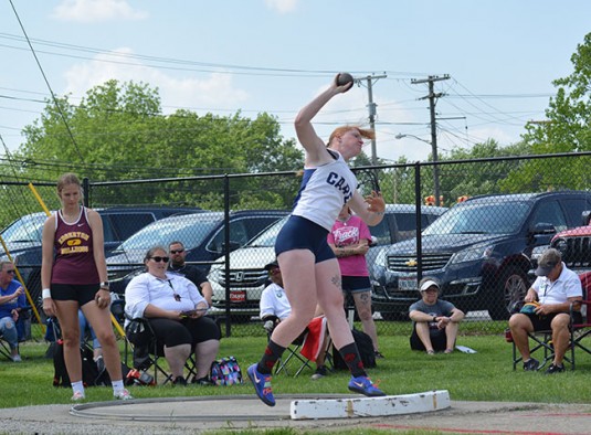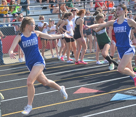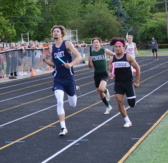 Riverdale advances relays, 2 individuals, Carey 1 to state meet Posted on May 23, 2024 0 Record breakers Riverdale’s Eden Barnes (left) takes the baton from Marissa Bonham in the 3200 relay Wednesday while Mohawk’s Claire Johnson waits her turn in the background. The Falcons set a school record of 9:44.86 while winning the regional to advance to state.Daily Chief-Union/David Barnes FOSTORIA — Both of Riverdale’s 3200 relays qualified for state, along with the Falcons’ Grant Inbody in the discus and Olivia Combs in the high jump, and Carey’s Abbie Bushong in the shot put on the first day of the Division III regional meet Wednesday at Fostoria Memorial Stadium. The Falcons girls won their race, with Eden Barnes, Chloe Powell, Allison Woodruff and Marissa Bonham finishing in a new school-record time of 9:41.33. That easily beat the previous mark of 9:44.86 set in 1991 and won the race by more than seven seconds. Riverdale’s boys qualified in the event for a second straight season, finishing fourth. Andrew Woodruff, Nick Tackett, Kason Barnes and Luke Donaldson finished the race in 8:22.37. State qualifier Carey’s Abbie Bushong puts all of her might into a throw in the shot put in the Division III district meet Wednesday at Fostoria. Bushong finished fourth to earn a spot in next week’s state meet.Daily Chief-Union/David Barnes Inbody was third in the boys discus with a throw of 147-11, while Olivia Combs cleared 4-11 in the high jump to take fourth place. Carey’s Abbie Bushong is headed to state in the girls shot put with a fourth-place throw of 35-7.75. The top four finishers in each event advance to state. Finals were held in half of the field events, plus the 3200 relay. Preliminaries were held for track sprint events, with the top eight qualifying for the finals Friday. In other girls finals results, the Falcons’ Katie Boucher scored a point in the shot put by placing eighth with a throw of 33-10.75. Shae Berger missed joining her teammate on the podium in the high jump, finishing 10th at 4-9. Mohawk’s girls 3200 relay team of Emerson Gurney, Claire Johnson, Lily Lawhorn and Cara Peterson finished in 15th place in 10:56.58. Hurdling to the finals Riverdale’s Kendel Rall (right) clears a hurdle in the 100 hurdles preliminary race Wednesday in the Division III regional track and field meet at Fostoria. Rall advanced to the finals in both the 100 and 300 hurdles.Daily Chief-Union/David Barnes The Warriors missed advancing to state in the boys 3200 relay by two places. Brayden Cleveland, Garrett Rinehart, Jett Loesser and Kolten Helton were sixth in 8:26.19, less than four seconds behind the fourth-place Falcons. Riverdale’s girls had a pretty good day in preliminary events too. Marissa Bonham had the second-best qualifying time in the 400 dash, finishing in 59.09 seconds. Kendel Rall made the finals of both hurdles events, qualifying fifth in the 300 in 48.16 and sixth in the 100 in 16.68. Ella Roach is in the 100 dash finals after posting the sixth-best preliminary time of 12.80. Rall, Barnes, Woodruff and Bonham are in the finals of the 1600 relay after qualifying third in 4:06.73. Roach just missed the finals in the 200 dash with a ninth-place time of 26.78. Riverdale also just missed the 800 relay finals in ninth place, with Roach, Barnes, Rall and Bonham finishing in 1:49.18. The 400 relay team of Kennedy Phelps, Lilly Hilvers, Roach and Emily O’Flaherty was 12th in 52.96. Finals-bound Carey’s Bryce Puckett (left) tries to hold off a couple of other runners in the 1600 relay Wednesday at Fostoria. The Blue Devils qualified eighth to reach the finals in the event, finishing in 3:34.51.Daily Chief-Union/David Barnes Carey’s Brody Baker led the way in preliminary events on the boys side, reaching the finals in both hurdles events. He qualified third in the 300 in 41.01 and sixth in the 110 in 15.62. Baker also teammed up with Brayden Young, Austin Niederkohr and Bryce Puckett to advance in the 1600 relay, with the team finishing eighth in 3:34.51. Niederkohr, Puckett, Baker and Tripp Phoenix missed out the 800 relay finals by two spots, finishing 10th in 1:34.46. Mohawk’s John Stansberry, Gavin Barth, Braxton Jenkins and Mason Schimpf were 12th in the same event in 1:35.77. Mohawk had two other relays come up short of qualifying for the finals. Barth, Schimpf, Loesser and Rinehart were 14th in the 1600 relay in 3:53.69. Stansberry, Jenkins, Barth and Schimpf came in 14th in the 400 relay in 46.52. Good run Mohawk’s Kolten Helton carries the baton in the regional finals of the 3200 relay Wednesday in Fostoria. Mohawk finished sixth in the event in 8:26.19 to score points but fall two spots shy of state qualifying.Daily Chief-Union/David Barnes Phoenix did not reach the finals in the 100 dash, running 11th in 11.39. He qualified but did not compete in the 200 dash. Jenkins was 16th in the 300 hurdles preliminary race in 44.32. Rinehart did not compete in the 400 dash finals. The Division III district meet concludes with field events at 4 p.m. and running event finals at 5:30 p.m. Friday at Fostoria Memorial Stadium. Girls Team results (3 events scored) 1. Liberty Center 18, 2. Riverdale 16, 3. Van Buren 14, 4. Danbury 10.5, 5. Kalida 9, 6t. Northwood 8, 6t. New Riegel 8, 8t. Evergreen 6, 8t. Hicksville 6, 10. Delta 5.5, 11t. Patrick Herny 5, 11t. Carey 5, 13. Pettsville 3, 14. Ottawa Hills 2, 15. Tinora 1. Final results 3200 relay: 1. Riverdale (Barnes, Powell, Al. Woodruff, Bonham) 9:41.33, 15. Mohawk (Gurney, Johnson, Lawhorn, Peterson) 10:56.58. Shot put: 4. Bushong (C) 35-7.75, 8. Boucher (R) 33-10.75. High jump: 4. Combs (R) 4-11, 10. Berger (R) 4-9. Preliminary results 100 dash: 6. Roach (R) 12.80. 200 dash: 9. Roach (R) 26.78. 400 dash: 2. Bonham (R) 59.09. 100 hurdles: 6. Rall (R) 16.68. 300 hurdles: 5. Rall (R) 48.16. 400 relay: 12. Riverdale (Phelps, Hilvers, Roach, O’Flaherty) 52.96. 800 relay: 9. Riverdale (Roach, Barnes, Rall, Bonham) 1: