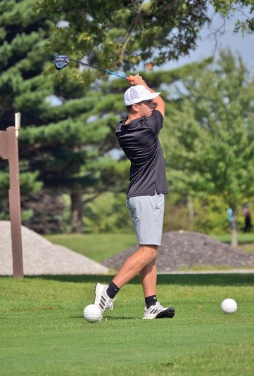 Upper Sandusky’s Sam Smith tees off on No. 1 on Monday at Lincoln Hills Golf Club. Smith finished with a 45 as the Rams won 182-201 against Buckeye Central.