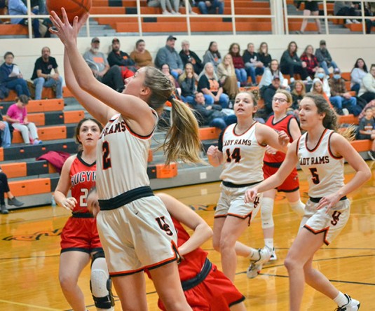 Upper Sandusky’s Addy Newman (2) puts up a shot on a fast break Friday against Bucyrus. Newman tied three other players for the team lead with eight points as the Rams overcame some turnover issues to defeat Bucyrus 55-38.