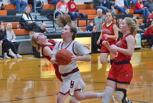 Upper Sandusky’s Zandria Gallant drives to the basket past Bucyrus defender Marissa Middleton, who attempted to take a charge. Gallant had six points in Upper Sandusky’s 55-38 victory on Friday.