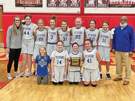 Wynford’s seventh grade girls basketball team won the Northern 10 Athletic Conference tournament Tuesday by beating Mohawk 21-15. The Royals are (front row, from left) manager Riley Hess, Alivia Ritzler, Caroline Sheldon, Ally Liming; (back row) coach Brittanie Ulmer, Alyssa Massey, Erin Wolfe, Cali Holbrook, Allie Bessinger, Brooke Frombaugh, Maggie Ridge, Lily Laippley and coach Erskine Braggs.