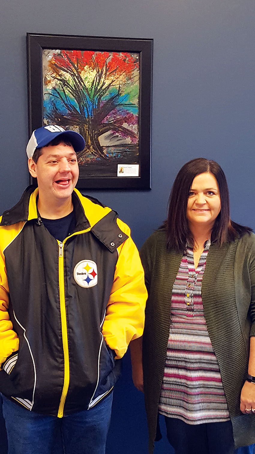 Art purchase Posted on January 17, 2018 0 Submitted photo Artist Micah Campbell (left) of Angeline Industries/Art Connections Studio, poses with his original art piece that hangs in the conference room at Quest Federal Credit Union. Lisa Bricely (right), branch operations vice president for Quest, purchased the oil painting at the annual Art Connections annual art auction fundraiser at Moreno’s in Carey.