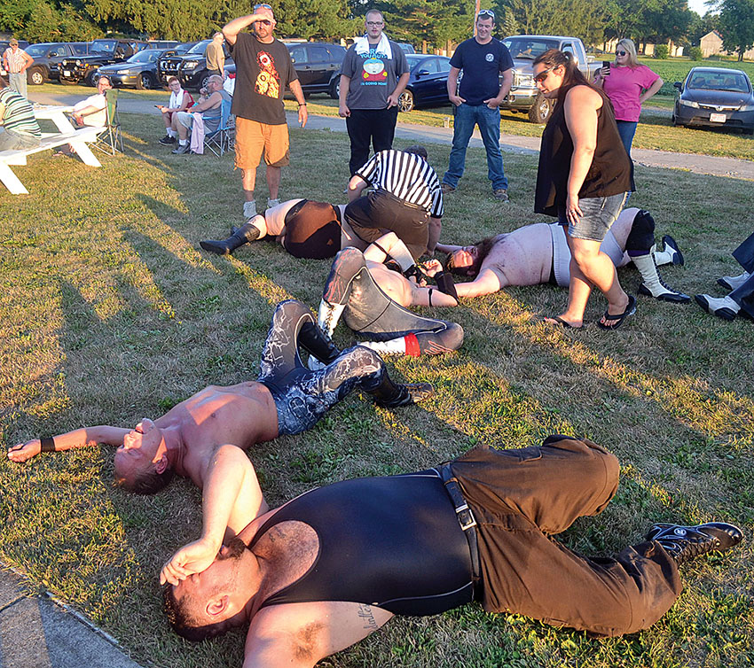 Aftermath Posted on July 14, 2018 0 Daily Chief-Union/Brian Hemminger Wrestlers Dennis Wolfe, Raptor, Adrian Anderson, Fat Tony, Ric Cardea and C.B. Kool were laid out at the end of the Savage Anarchy Wrestling main event Friday in Nevada after Kool jumped off an ambulance onto the group to close out the evening.