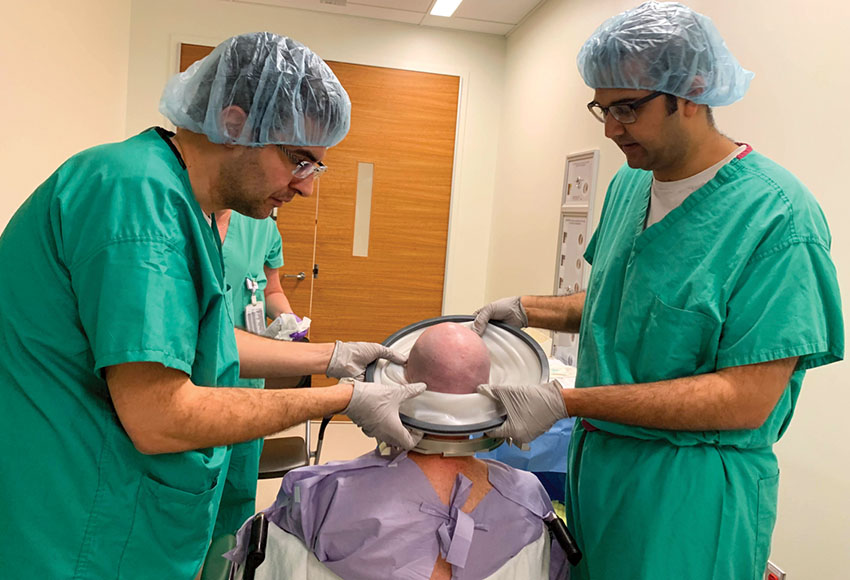 Clinical trial Posted on May 31, 2019 0 Submitted photo Dr. Vibhor Krishna (right) fits David Shorr with a helmet-like device used in a new clinical trial for Alzheimer’s Disease at The Ohio State University Wexner Medical Center. The device uses MRI-guided imaging to deliver focused ultrasound to specific areas of the brain to open the blood-brain barrier.