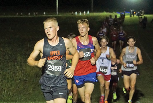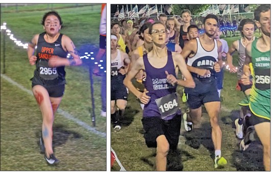 Hinesman helps Upper boys take ninth at night CC meet Posted on September 11, 2023 0 Late night run Upper Sandusky’s Evan Hinesman crosses the 2-mile marker Saturday night at the Seneca East Stars, Stripes and Lights cross country meet Saturday night. Hinesman led the Rams with a time of 17:25.79.Daily Chief-Union/Brian Hemminger ATTICA — Upper Sandusky’s boys were ninth in the Division II race, while Mohawk’s Brayden Cleveland was the top individual placer, coming in fourth in the Division III race of Seneca East’s Stars, Stripes & Lights cross country meet Saturday night. The Rams boys finished with 205 points. Utica was the champion with a 101-151 advantage over Ontario. Evan Hinesman was Upper Sandusky’s top placer, coming in 14th in 17:25.79, with Jameson Reile finishing 34th in 18:04.73. Elijah Robinson was 45th in 18:23.06, Abe Baldwin took 49th place in 18:29.86, and Henry Minehart was 66th in 19:02.17. Keystone’s Michael Gale won the Division II race in 16:33.85. Cleveland was faster in the Division III race, finishing in 16:27.0, but that did not nearly match Northwestern’s Kade Tegtmeier, who finished in 15:53.09. The Warriors’ Myer Kirian was the top freshman finisher in Division III, taking 24th place overall in 17:47.47. Another freshman, Phoenix Nally, was 56th in 18:46.82. Marty Justen was 125th in 20:21.12, and Tyler Coppus came in 146th in 21:07.70, for the 12th-place Warriors, who scored 314 points. Carey’s Brayden Young finished 26th in 17:55.1, with Riley Miller placing 72nd in 19:11.57. Damon Zimmerly was 156th in 21:26.38, Owen Sidor took 170th place in 21:42.95, and Brylon Middleton finished 196th in 22:49.15. The Blue Devils were 20th with 493 points. Off to the races Above, left: Upper Sandusky’s Ana Hernandez competes in the D2 girls race Saturday at Seneca East. Herhandez ran 25:44.30. Above, right: Carey’s Damon Zimmerly runs in the pack during the D3 boys race. Zimmerly ran 21:26.38.Daily Chief-Union/Brian Hemminger Brennen Westrick led Wynford by placing 135th in 20:39.98. Drew Pope was 158th in 21:30.63. After that, four runners were between 186th and 192nd for the Royals, who were 24th as a team with 661 points. Mount Gilead was the Division III boys champion 81-131 over Seneca East. Carey’s Chloe Etzinger took fifth place in the girls Division III race, finishing in 19:55.24. Abby Kurtz was 23rd in 21:46.83, Gracie Luhring took 52nd place in 23:17.68, and Grace Bianchi was 62nd in 23:39.18. Alexis Mattimoe completed the team score by finishing 90th in 25:11.96. The Blue Devils were seventh with 196 points. For Mohawk, Addie Horner was 10th in 20:45.87, while Claire Johnson came in 31st in 22:13.15. Lilly Lawhorn finished 61st in 23:35.19, with Izzy Lawson placing 89th in 25:10.87. For Wynford, Bri Westrick was 21st in 21:45.12, Kolbie Allgyre finished 100th in 25:57.66, and Ruby Stone was 129th in 28:37.08. Neither Mohawk nor Wynford had enough runners to score as a team. Edison was the Division III girls champion 73-84 over Seneca East. New London’s Reese Landis won in 18:01.51. In Division III, Upper Sandusky’s Hope Morris was 12th in 20:47.03, Abigail Ault finished 16th in 21:08.13, Brynlee Cundiff took 46th place in 22:43.78, and Ana Hernandez placed 89th in 25:44.30. Indian Lake was the Division II girls champion 113-145 over Utica. Johnstown’s Reece Savage was the individual champion in 19:15.70. Upper Sandusky’s junior high boys were third in the Division II/III 2-mile race, led by runner-up Carter Pohlman, who finished in 10:53.38, breaking his own school record he set last week. In the Division III boys race, Carey’s Callen Lewis was 40th in 13:36.05, Mohawk’s Evan Mullholand came in 30th in 13:06.78, and Wynford’s Kyle Pope was 47th in 13:55.70. Carey’s girls were second in Division III junior high competition, led by Ema Ritter’s runner-up finish in 12:10.31. Wynford’s Aubrey Ritzler was the champion in 11:57.15. Mohawk’s Eva Johnson finished 11th in 13:33.81. Upper Sandusky’s Madison Miles finished eighth in 13:32.06 in the Division I/II race. Carey and Mohawk compete in the Cline-Windom Lakota Invitational at 8:30 a.m. Saturday. Upper Sandusky and Wynford run in the Galion Festival at 9 a.m. Saturday at Ammans Reservoir. Girls Division II Team results Indian Lake 113, 2. Utica 145, 3. Bloom-Carroll 157, 4. Galion 162, 5. Northridge 163, 6. Perkins 168, 7. Springfield Northwestern 173, 8. Ontario 184, 9. Highland 187, 10. Buckeye Valley 189, 11. Willard 194, 12. Johnstown 250, 13. Firelands 291, 14. Otsego 297, 15. Clear Fork 366, 16. Brookside 411, 17. Keystone 534. Individual results Upper Sandusky: 12. Morris 20:47.03, 16. Ault 21:08.13, 46. Cundiff 22:43.78, 89. Hernandez 25:44.30. Winner: Savage (J) 19:15.70. Division III Team results Edison 73, 2. Seneca East 84, 3. Mount Gilead 158, 4. Elmwood 166, 5. New London 190, 6. Hopewell-Loudon 196, 7. Carey 196, 8. Sandusky St. Mary 211, 9. Wellington 221, 10. East Knox 227, 11. Gibsonburg 254, 12. Mapleton 263, 13. Buckeye Central 282, 14. Dalton 337, 15. Open Door Christian 339, 16. New Riegel 369. Individual results Carey: 5. Etzinger 19:55.24, 23. Kurtz 21:46.83, 52. Luhring 23:17.68, 62. Bianchi 23:39.18, 90. Mattimoe 25:11.96, 117. Walton 26:40.38, 122. Gery 27:12.35, 126. Crim 28:03.17, 153. Zimmerly 37:11.72. Mohawk: 10. Horner 20:45.87, 31. Johnson 22:13.15, 61. Lawhorn 23:35.19, 89. Lawson 25:10.87. Wynford: 21. Westrick 21:45.12, 100. Allgyre 25:57.66, 129. Stone 28:37.08. Winner: Landis (NL) 18:01.51. Boys Division II (top 10 and local of 21) Utica 101, 2. Ontario 151, 3. Otsego 171, 4. Johnstown 174, 5. Northridge 175, 6. Keystone 176, 7. Bloom-Carroll 179, 8. Highland 197, 9. Upper Sandusky 205, 10. Perkins 220. Individual results Upper Sandusky: 14. Hinesman 17:25.79, 34. Reile 18:04.73, 45. Robinson 18:23.06, 49. Baldwin 18:29.86, 66. Minehart 19:02.17, 113. Miller 20:21.44, 115. Weyand 20:24.04, 123. Roe 20:44.57, 179. Penwell 